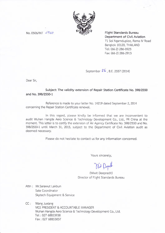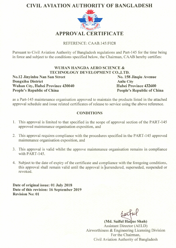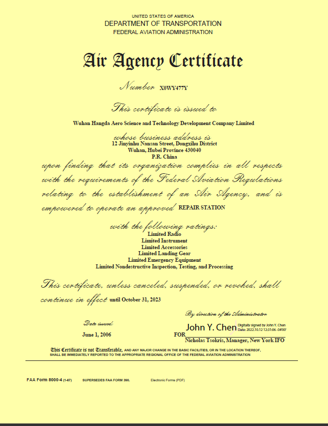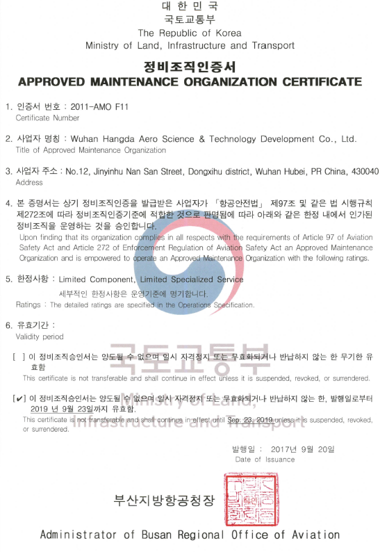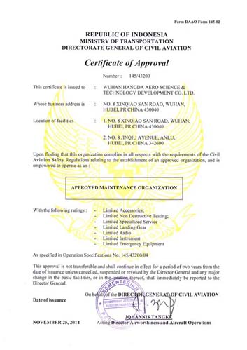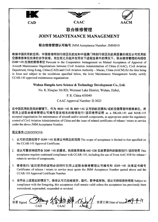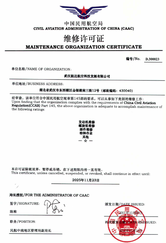 200110月    公司獲中國(guó)民航總局授權(quán)的民航維修許可證。